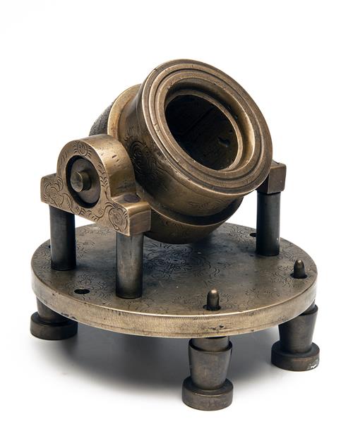 probably 19th century and originally intended as a mid-day signal gun, with squat banded 5in. barrel including cascabel, Chinese form scroll engraving, twin dual-pillared mounts for the trunnions mounted to a circular orientally engraved base with four turned feet (provision for six)