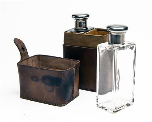 with two decanters, each with Regency cut glass, measuring approx. 5 1/2in. x 1 /34in., pewter screw top with glass cork, with twin-sectioned fitted leather case embossed with 'H.O.S.'