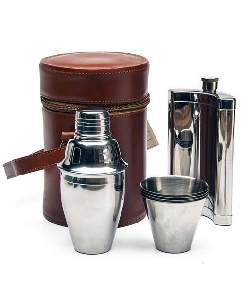with three stainless steel 8oz. hip shaped flasks, a central cocktail shaker, with four stainless steel cups, neatly fitted into a cylindrical leather zip case with leather carry handle