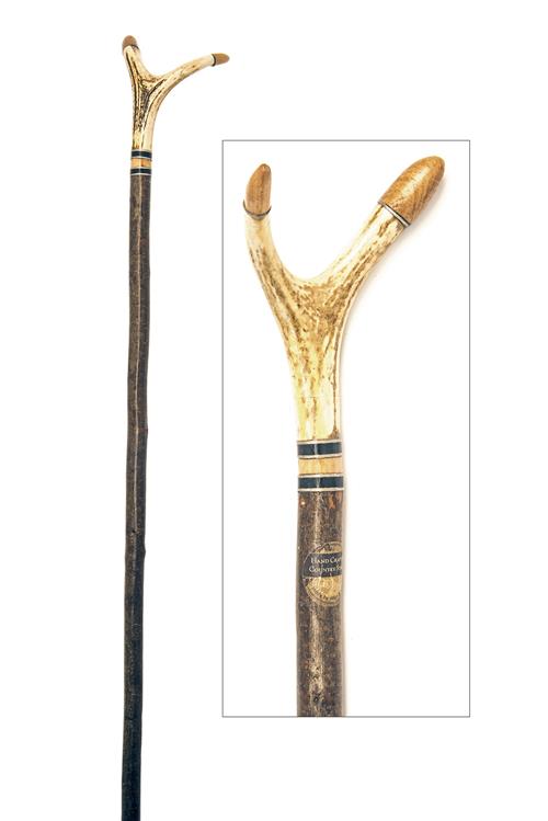 JOHN S. COX A HAND-MADE SCOTTISH RED DEER ANTLER THUMB STICK,