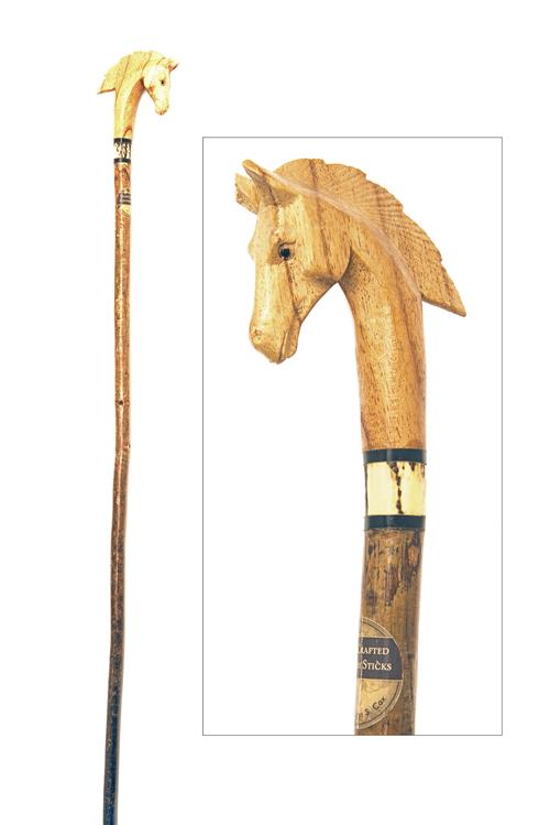 with seasoned English hazel shaft, with carved horse head top, stag and buffalo horn spacers, brass ferrule, measuring approx. 51in.