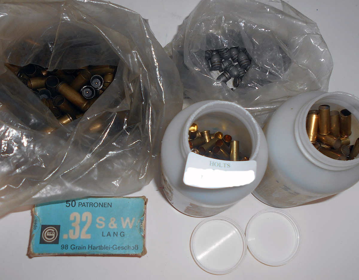 100 .32 S&W LONG CASES AND BULLETS, 150 .44 REM MAG CASES AND BULLETS , 20 .32 LONG AMMUNITION, comprising of approximately 100 .32 s&w long cases for reloading, some primed, 150 primed .44 rem mag cases and a quantity of 20 rounds of 32 S&W long cartridges by geco and about 100 .44 lead bullets, 150 .311 lead bullets for s&w cases.