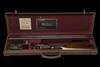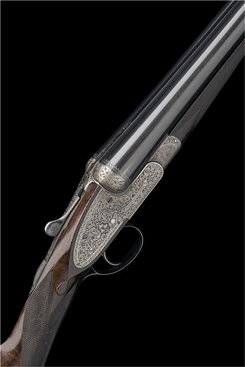 28in. nitro barrels, the rib engraved 'WILLIAM EVANS (FROM PURDEY'S). 63. PALL MALL. ST. JAMES'S. LONDON.', 2 1/2in. chambers, bored approx. imp. cyl. and 1/2 choke, treble-grip action, removable striker discs, the toplever gold-inlaid 'EVANS PATENT SINGLE TRIGGER', automatic safety with gold-inlaid 'SAFE' detail, profusely engraved with bold arabesques and scrolling acanthus, interspersed with floral motifs, pins reblued, 13 3/4in. stock with scroll engraved steel heel and toe plates, weight 6lb. 10oz., in its makers lightweight tan leather case