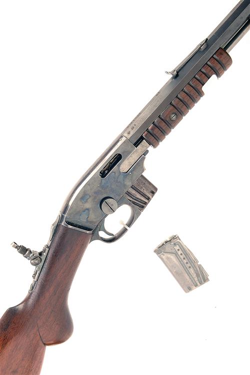 SAVAGE ARMS CO. PUMP-ACTION REPEATING TAKE-DOWN SPORTING RIFLE, serial no. 139855, 24in. octagonal nitro barrel,bead fore-sight, leaf rear-sight, folding tang rear peep-sight, manual safety, 2 x detachable magazines, 13 7/8in. semi-pistolgrip stock