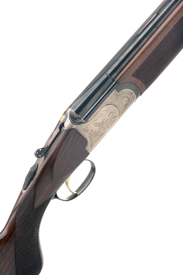 FAIR 20-BORE (3IN.) 'JUBILEE' SINGLE-TRIGGER OVER AND UNDER EJECTOR, serial no. 142840, 28in. nitro barrels with 6mm ventilated matt top-rib, 3in. chambers, multichokes (no spares), hold-open toplever pierced with a flower, automatic safety with integral barrel selector, gold-washed single trigger, acanthus scroll engraving surrounding game scene vignettes, brushed finish, 14 1/4in. semi-pistolgrip stock including 1/4in. wooden extension, weight 6lb.