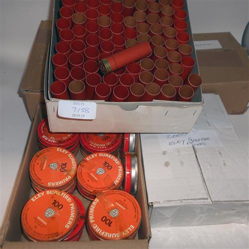 200 ELEY KYNOCH 12 BORE PRIMED PAPER CASES WITH 10,000 ELEY PRIMERS comprising of two plain carton with 100 unprinted Eley Kynoch primed 12 bore shotgun paper cases in each with approximately 10,000 eley surefire shotgun primers