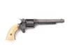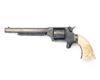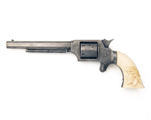 circa 1861-62, with 5 3/4in. octagonal barrel, the top flat unsigned, small blade fore-sight, sighting groove to the scroll engraved top-strap, borderline and scroll engraved one-piece iron frame (hinged loading gate missing), plain cylinder with front locking notches, sheath trigger, smooth flared ivory grips, the left with a raised carved bust of an early American frontiersman wearing a feathered cap and with sprung ejector rod stored beneath barrel