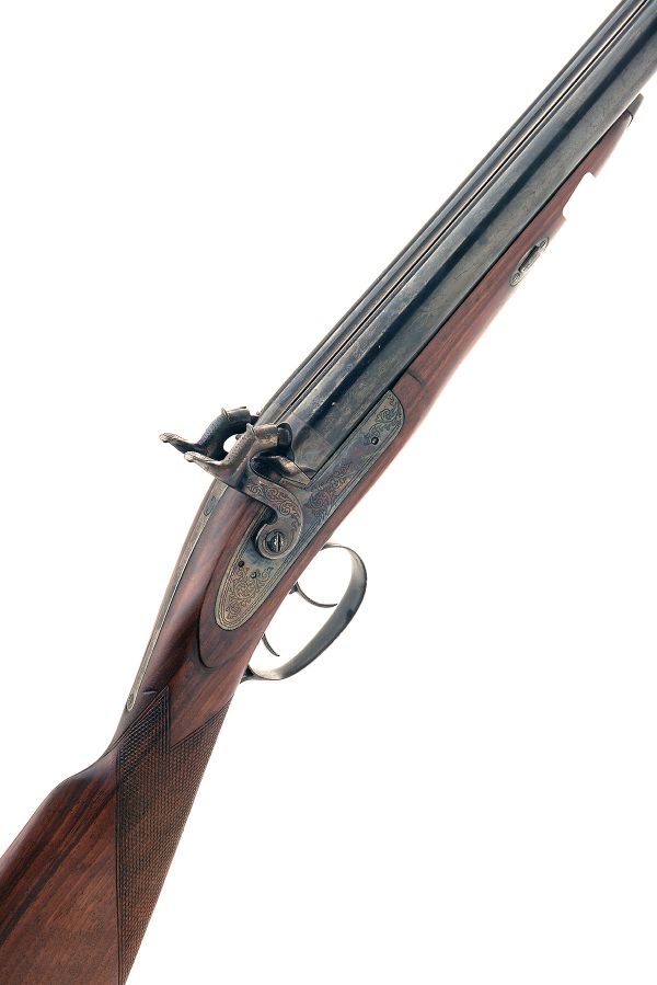 A REPRODUCTION 12-BORE PERCUSSION DOUBLE-BARRELLED SPORTING-GUN SIGNED NAVY-ARMS, MODEL 'DELUXE', serial no. N9816, with 28 1/2in. barrels, engraved colour-hardened locks and walnut half-stock, partial ramrod only