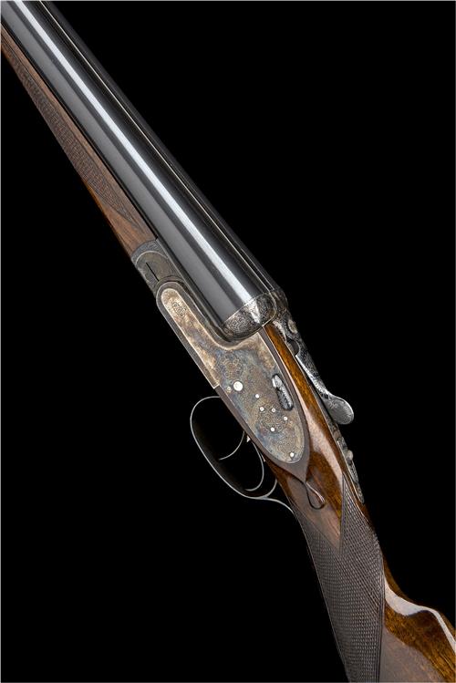 28in. nitro chopperlump barrels, 2 3/4in. chambers, bored approx. 1/4 and 3/4 choke, removable striker discs, automatic safety with inlaid 'SAFE' detail, hand-detachable lockplates, gold-inlaid cocking indicators, articulated front trigger, rolled-edge triggerguard, retaining some original colour-hardening and finish, 14in. stock, weight 6lb. 9oz.
