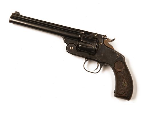 circa 1890, with 6 1/2in. blued round barrel with raised sighting rib, blade fore-sight, adjustable notch rear-sight on the opening catch, blued fluted cylinder, blued frame, the back-strap and butt cut for mounting a shoulder-stock (missing), chequered walnut grips without medallions, 'straw' finish to screws and ancillaries
