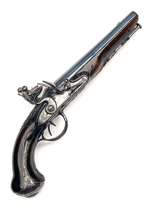 French, circa 1790, with slightly shortened 7 1/8in. re-blued barrels, engraving at the breech-end and along rib (rubbed), deep eared sighting groove to top-tang, flat borderline and scroll engraved locks, lozenge-shaped pans, engraved hammers and frizzen-fronts, walnut full-stock florally carved around the top-tang and with carved borders around the furniture (inlet repair to fore-end tip), engraved iron long-eared butt-cap, pillar-fronted engraved iron trigger-guard tang and bow and later replacement iron ramrod