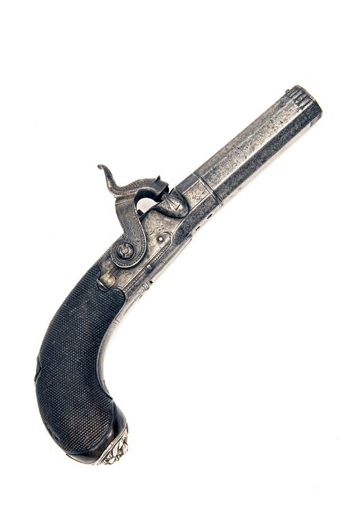 A 40-BORE PERCUSSION SIDE-HAMMER POCKET-PISTOL, no visible serial number,