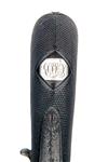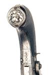 circa 1835, with octagonal turn-off 2 3/8in. barrel, engraved band at muzzle, small fore-sight bead, engraved borders at the join, scroll engraved squared boxlock action with radiused corners signed in a borderline engraved panel on the left hand side 'CLABROUGH, LINCOLN', notch rear-sight to the trophy engraved top-tang, engraved dolphin-headed side-hammer with sliding safe behind, finely chequered walnut bag-shaped butt fitted with a white metal lion-mask butt-cap, initialled clipped-corner rectangular escutcheon to wrist and flush-fitting folding automatic trigger