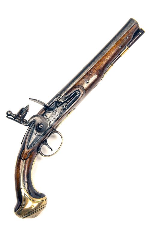 circa 1780, with slightly swamped round iron 8in. barrel, the top of breech engraved with a borderline needle and tear-drop and marked 'LONDON, SUC'R TO BARBAR', London proofs, engraved top-tang, straight radiused lock with borderline engraving and pointed tail signed 'CLEMMES, SHUG LANE' below the pan, bridleless frizzen, walnut full-stock with swollen pommel capped with a brass butt-cap with long side-spurs, engraved trigger-guard bow and finial, pierced side-plate with feathered tip and turned ramrod pipes with brass tipped ramrod