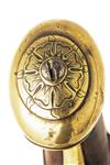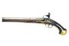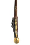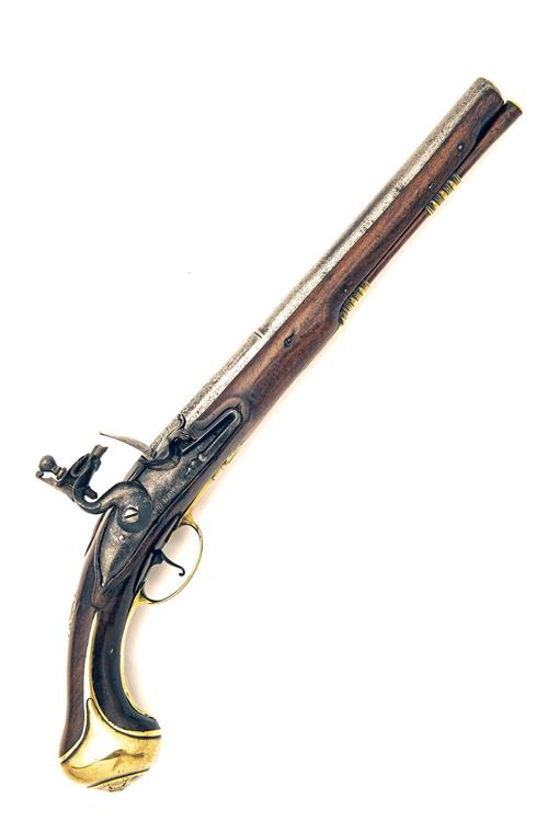 English circa 1755, with two-stage 12in. slightly swamped iron barrel, London proofs and 'F.T.' makers stamp at breech, squared solid top-tang, curved and radiused plain iron lock with pointed tail and signed 'TURVEY' below the pan, moulded hammer, pan foot and bridle-less frizzen, walnut full-stock with bulbous pommel and slightly swollen at the ramrod throat, moulded brass long-spurred butt-cap, engraved brass side-plate with feathered terminal, moulded brass trigger-guard tang with engraved bow and turned ramrod thimbles with brass tipped wood ramrod