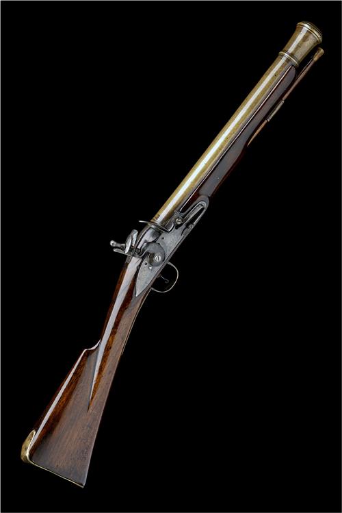 A 12-BORE FLINTLOCK BRASS-BARRELLED BLUNDERBUSS SIGNED 'WHEELER & CO', no visible serial number,