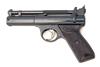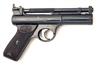 post war, with blued 6 3/4in. barrel, stirrup locking catch, adjustable rear-sight blade, blued stepped air-chamber with make and model details highlighted in white paint, three pin trigger group, chequered brown bakelite grips, much original finish throughout and complete with its maker's card carton with green label and wood-grain effect paper covering (losses and wear)
