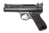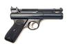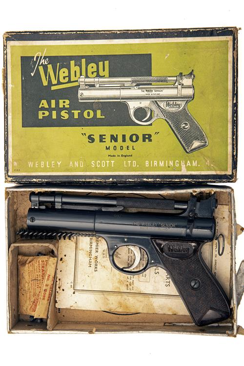 post war, with blued 6 3/4in. barrel, stirrup locking catch, adjustable rear-sight blade, blued stepped air-chamber with make and model details highlighted in white paint, three pin trigger group, chequered brown bakelite grips, virtually all its original finish remaining throughout and complete with its maker's card carton with green label and black paper covering (small losses), cleaning brush, pellet sample envelope and instruction label (tray worn)