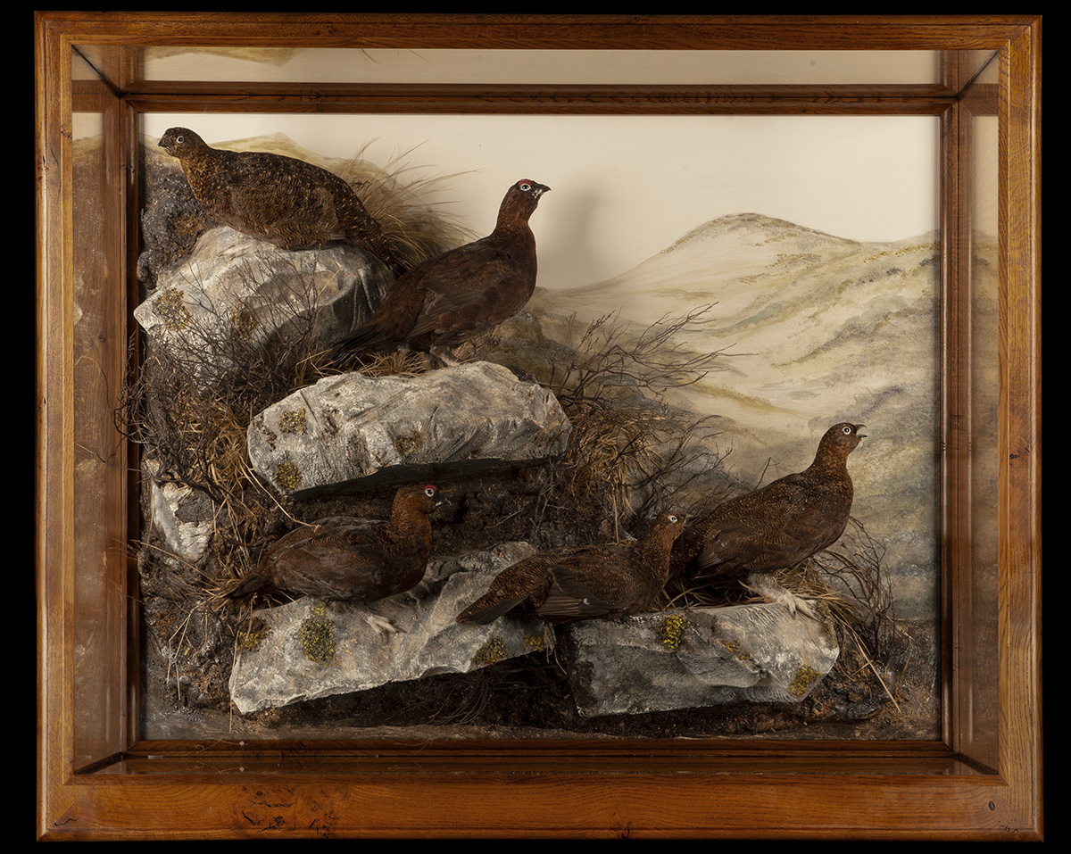 showing four cocks and a hen, with a natural habitat, set in an oak wall-mount frame, shot at The Strathmore Estate Holwick, measuring approx. 53in. x 44in. x 16in.