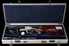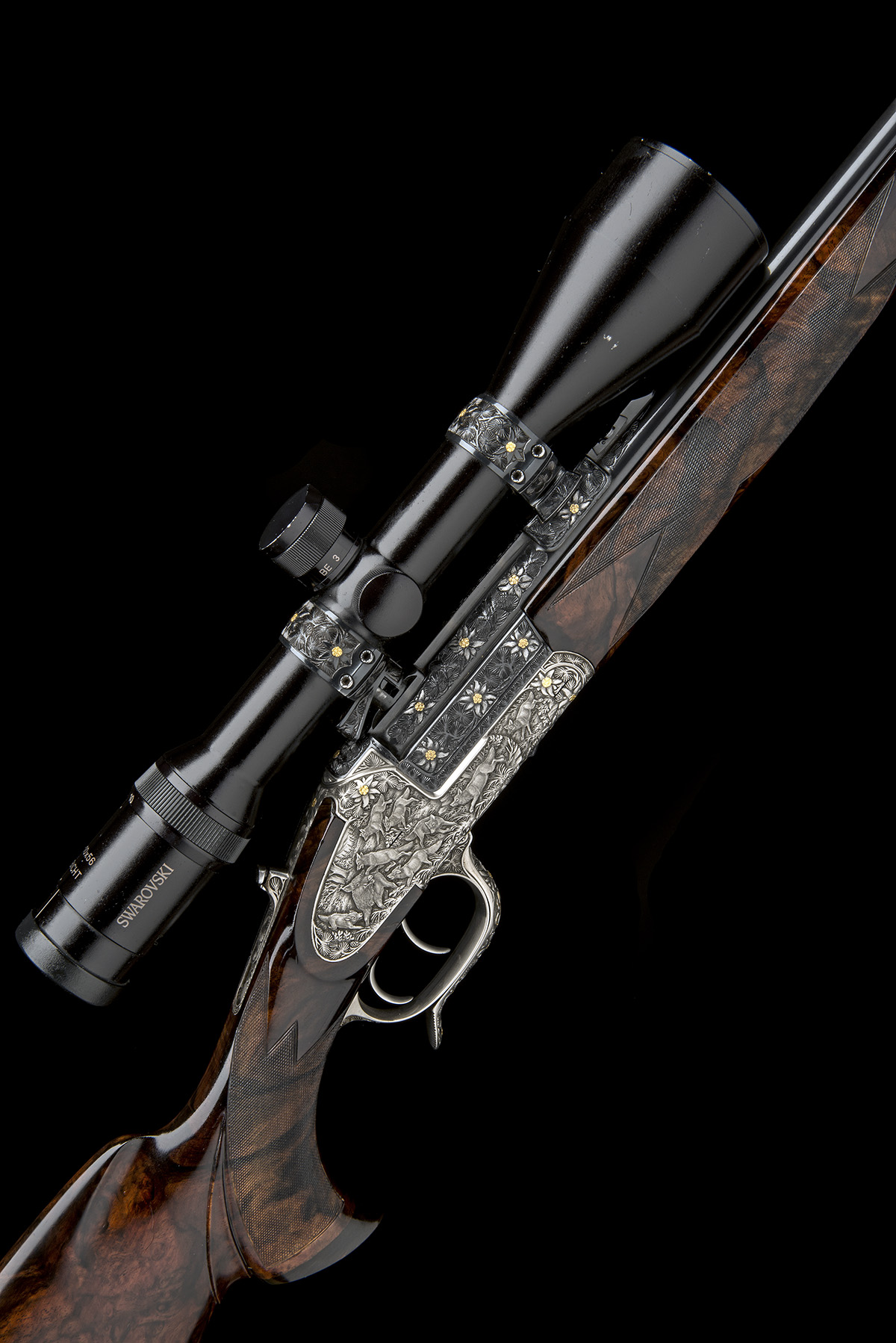 25 5/8in. nitro barrels signed 'H. Scheiring - Ferlach', stylised floral carved sight rib with open sights and carved ramp-mounted bead fore-sight, the breech end profusely relief engraved and gold-inlaid with exotic floral designs and mounted with a Swarovski 2,5-10x56 Habicht telescopic sight, serial number P714813920, in florally carved and gold-inlaid quickly-detachable mounts, Jaeger patent 'verticalblockverschluss' action with sprung breech face, top tang with sprung safety / cocking lever, side-mounted large/small barrel selector switch marked GR / KL, set triggers, the furniture profusely carved in relief with further gold-inlaid exotic flowers and the left side with an extended carved scene of red deer, the right side with a pack of wolves attacking wild boar, the underside carved and gold-inlaid with a retriever, titled 'HAZEL', bright finish overall, 15in. very highly-figured stock with birdshead pistolgrip with horn cap, sculpted cheekpiece, hogsback comb, sling eyes, hinged steel ammunition trap engraved en suite to the action, and including 5/8in. rubber recoil pad, schnabel fore-end with carved fittings, weight 7lb. 5oz. (unscoped) and 8lb. 13oz. (with scope), in a lightweight alloy flight case (handle broken)