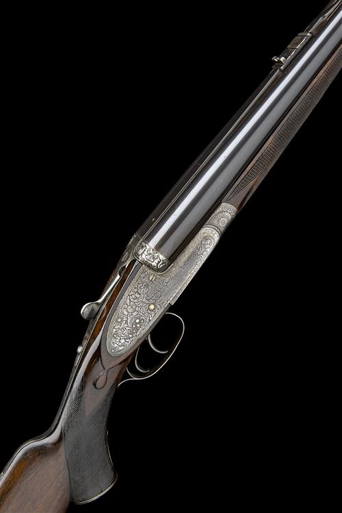 26in. nitro chopperlump barrels, matt sight rib (matt finish worn) gold-inlaid '2' at the breech end, open sights with two folding leaf sights, marked 100, 200 and 300, ramp-mounted bead fore-sight with flip-up moonsight, treble-grip action with hidden third bite, removable striker discs, elongated top strap, automatic safety with gold-inlaid 'SAFE' detail, gold-inlaid cocking-indicators, the fences deeply carved in high relief with floral designs and masks of the Green Man, the action, lockplates and furniture with bold scrolling acanthus of art nouveau style, the underside with a roundel engraved 'CHARGE 75 GRAINS CORDITE .465. CASE 3 1/4 INCHES', 14 3/8in. replacement pistolgrip stock (repair to grip) with cheekpiece, engraved steel pistolgrip-cap (with trap), sling swivels and including 3/4in. ventilated rubber recoil pad, fore-end with grip catch release lever, replacement wood with light damage, weight 10lb. 9oz.