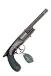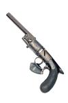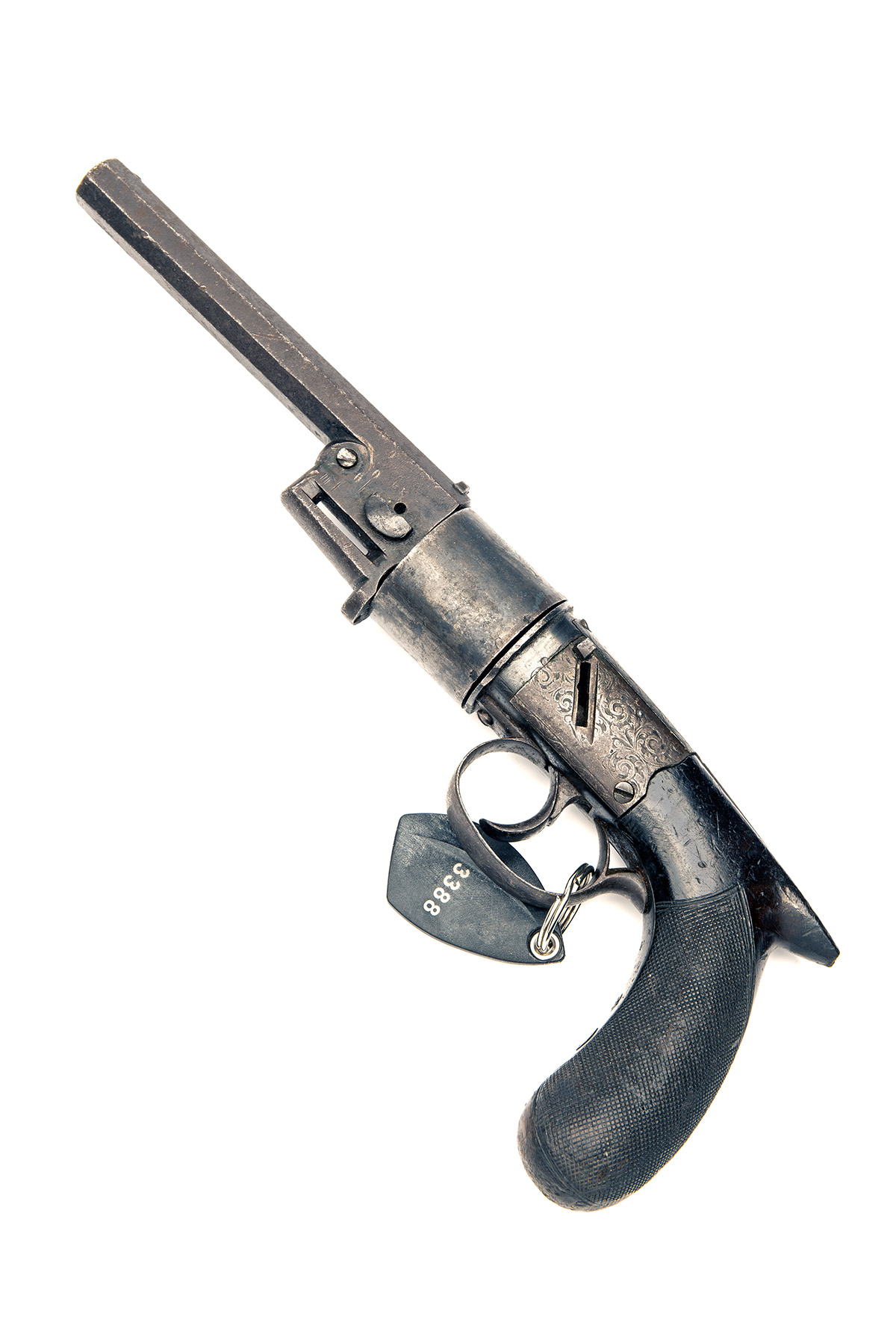 collection reference 3388, circa 1860 with later conversion to rimfire (possibly originally dual ignition with spare percussion cylinder), octagonal 5 1/2in. barrel, the top-flat signed 'HARVEYS PATENT No. 3644', small bead fore-sight, dove-tailed standing notch rear-sight, missing articulated rammer, barrel fixed via a wedge, plain cylinder, missing bottom-strap, border and scroll engraved radiused boxlock hammerless action missing sliding safe from the left hand face and modified internal hammer-nose, finely chequered saw-handled bag-shaped grip and guarded self-cocking trigger, further small losses possible, traces of original finish