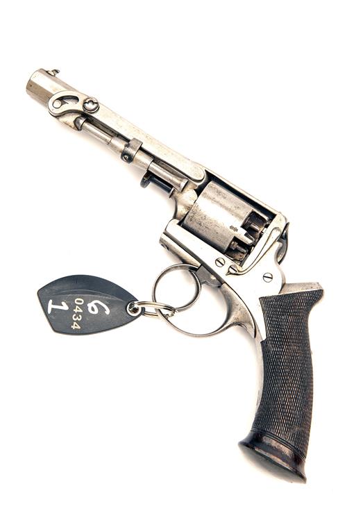 collection reference 0434, circa 1858, with octagonal 4 1/4in. barrel fitted with a Brazier Patent rammer to the left hand side, beaded blade dove-tailed fore-sight, standing notch rear-sight to the top-strap, plain London proved cylinder, plain solid frame with self-cocking trigger and spurless hammer and finely chequered semi saw-handled grip with polished horn pommel-cap, the whole 'in the white' except hammer