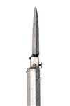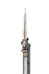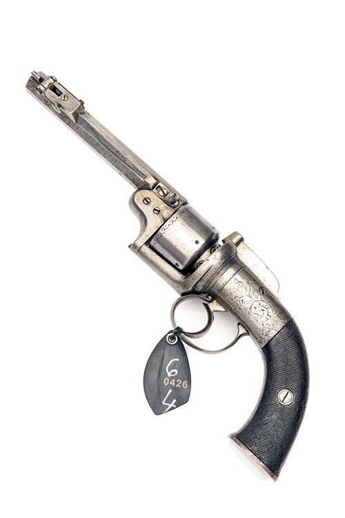 collection reference 0426, circa 1845, with octagonal 5 1/2in. barrel, bead fore-sight, folding bayonet mounted to the left hand side and released via a catch on the action body, open frame with integral nipple-guard, plain six-shot cylinder with scroll engraved band to leading edge and scroll engraved rounded bar-hammer action, guarded trigger and finely chequered walnut grips, the whole cleaned with loss to detail.