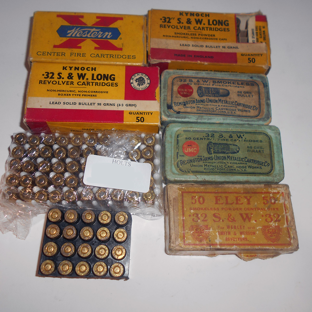 270 ROUNDS .32 COLLECTABLE PISTOL AMMUNITION comprising of 7 rounds .32 S&W long revolver by kynoch boxed, 30 rounds .32 S&W cf 88grn by Remington UMC in original box, 49 rounds .32 S&W 88grn Rem UMC, in original box, 50 rounds of .32 S&W by Eley for Smith & Wesson revolvers in original box, 14 rounds of 98 grn S&W long by Western in original box, 50 rounds of .32 S&W Long for revolvers by Kynoch in original box, 70 .32 auto.