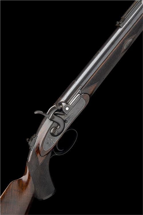 circa 1864, with blued 36in. heavy round tapering barrel, the top signed at breech 'WHITWORTH, MANCHESTER' around the wheatsheaf trademark, square dove-tailed fore-sight mounting-block, the rear-sight base signed along the right hand side 'MANCHESTER ORDNANCE & RIFLE CO', colour hardened squared breech-block, short carved sighting rib, plain colour-hardened top-tang with applied dove-tail mount, plain bar-action lock (traces of colour) signed 'MANCHESTER ORDNANCE & RIFLE CO.', chequered walnut figured pistol-grip half-stock, chequered iron heel-plate, moulded horn pistol-grip cap, serial number to the lower tang, chequered trigger blade and smooth rounded horn fore-end tip with no provision for ramrod, all sights absent but complete with its probably original canvas storage case painted in black bitumen, the interior compartmented and lined in green baize and containing a cleaning rod, spring cramp, Whitworth mould (numbered 549), nipple cleaning set, brush and a sporting gun