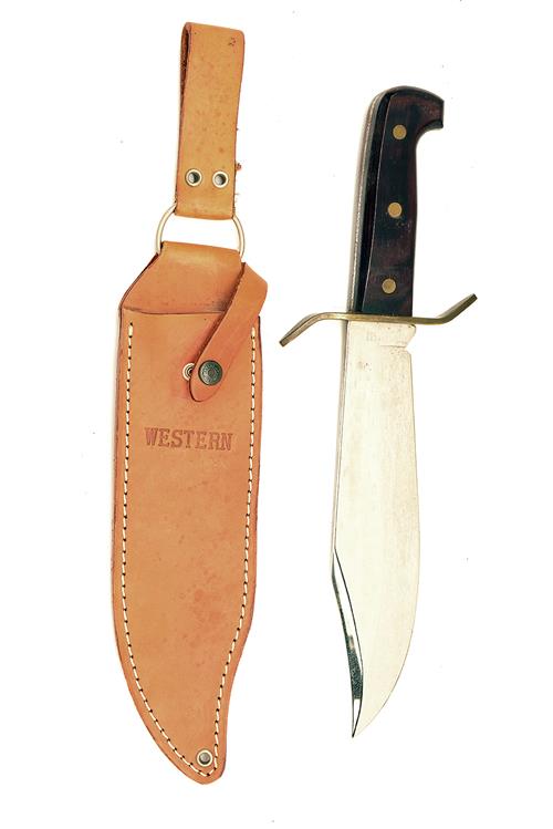 A LARGE BOWIE-KNIFE WITH DISPLAY-BOARD, SIGNED 'WESTERN', MODEL 'W49-M', circa 1975, with 9 1/4in. polished blade signed at the forte (some light storage corrosion), brass 'S' shaped cross-guard and smooth walnut pistol-grip hilt fixed by three brass rivits, complete with a wooden display board with moulded border bearing an applied plaque 'AUTHENTIC BOWIE KNIFE CIRCA 1840', and together with its leather sheath.