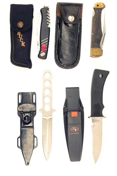 FOUR MODERN SPORTING KNIVES, comprising of two fixed blade knives, on all steel with stiletto blade partially serrated on one edge, both with hard plastic sheaths and two folding knives, one a multi-blade example signed 'BUCK', the other by 'BURTON McCALL', both with belt pouches, all with approximately 4in. main blades (4)