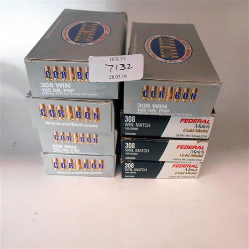 160 ROUNDS OF .308/7.62 AMMUNITION BY FEDERAL AND CORBON, comprising of 100 Corbon 165 grn psp sn, 60 rounds of Federal 168 grn bthp gold medal matchking