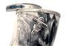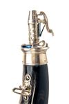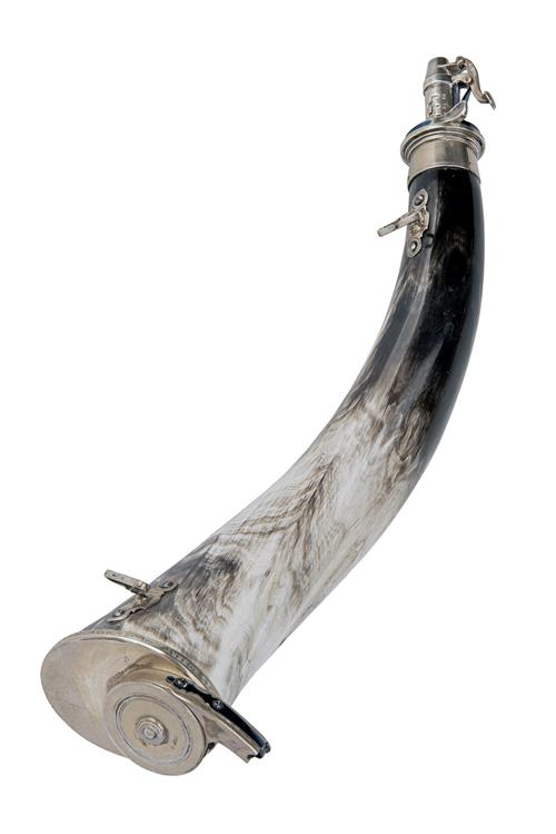 dated for 2005 and fully marked, the black and white horn body approximately 13in. overall (two repairs from new), the sterling silver safety nozzle adjustable from 2 to 3 drams in 1/4 dram increments, finely blued springs, the sterling base-plate inscribed around the edge 'PETER ROBERT KNOTT 20TH MAR. 1946 - 1 MAY 2005' and fitted with a solid silver fully marked snail capper also with finely blued springs, the sides of horn with two silver sling-mounts