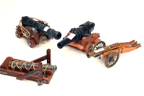 FOUR INERT SCALE-MODEL CANNONS, each of iron, brass, wood, diecast metal and plastic construction, the largest 11in. overall (4)