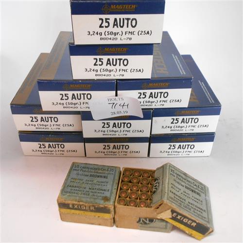 550 ROUNDS OF .25 AUTO AMMUNITION, SOME COLLECTABLE, comprising of two boxes of 25 collectable FN Browning cartridges in each, 500 rounds of Magtech 50 grn FMC
