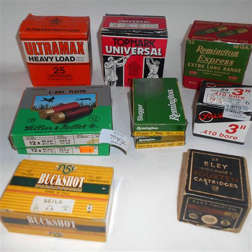 2 3/4in., 20 S&B 2 1/2 in 7/8th oz load plastic slug, cartridges, 10 Remington 12 bore slug 7/8th oz, 25 .410 Eley fourten 5 shot, 20 .410 Lyalvale 3in. magnum 6's, 10 12 bore NSI buckshot SG?LG 2 3/4in.