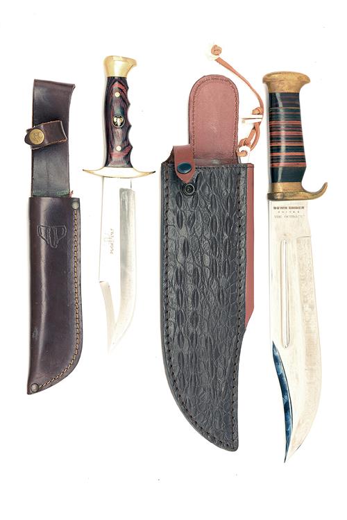 TWO BOWIE KNIVES, the first a large example signed 'DOWN UNDER KNIVES', model 'THE OUTBACK', with brass furniture, leather handle and imitation crocodile skin scabbard, the second of smaller size and signed 'BUSH LINE', with polished micarta scales and brass furniture, in a leather scabbard (2)