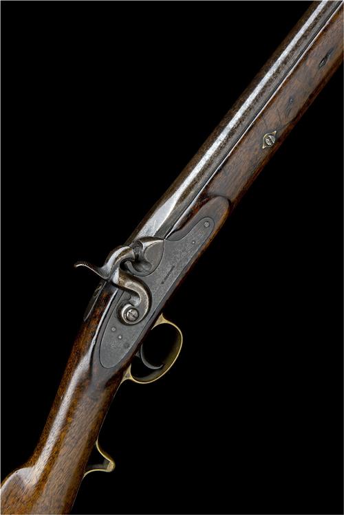 circa 1857, with round 22in. barrel, blade fore-sight, breech of octagonal form signed 'W. GREENER LONDON' and marked ''15' over 'NIC' over '142' on top, plain top-tang with standing notch rear-sight, carved snail, plain lock of flint form signed 'W. GREENER', walnut full-stock with brass furniture including heel-plate and finger-spurred lower tang, flat brass nose-cap and captive iron swivel ramrod and stirrup swivels