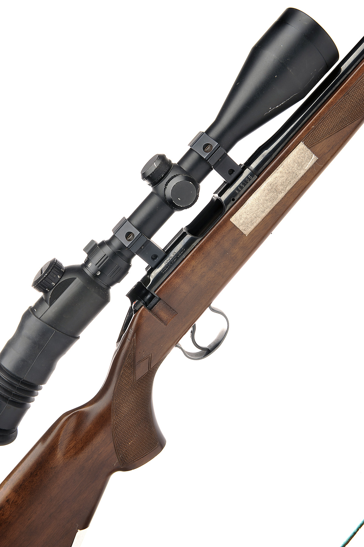 CZ .17HMR 'MODEL 452-2E AMERICAN' BOLT-MAGAZINE SPORTING RIFLE, serial no. 365105, 23in. unsighted nitro barrel, fitted with a sound moderator, fitted with a 3-9x50E telescopic sight, bolt missing, detachable magazine missing, 13 1/2in. pistolgrip stock, leather sling