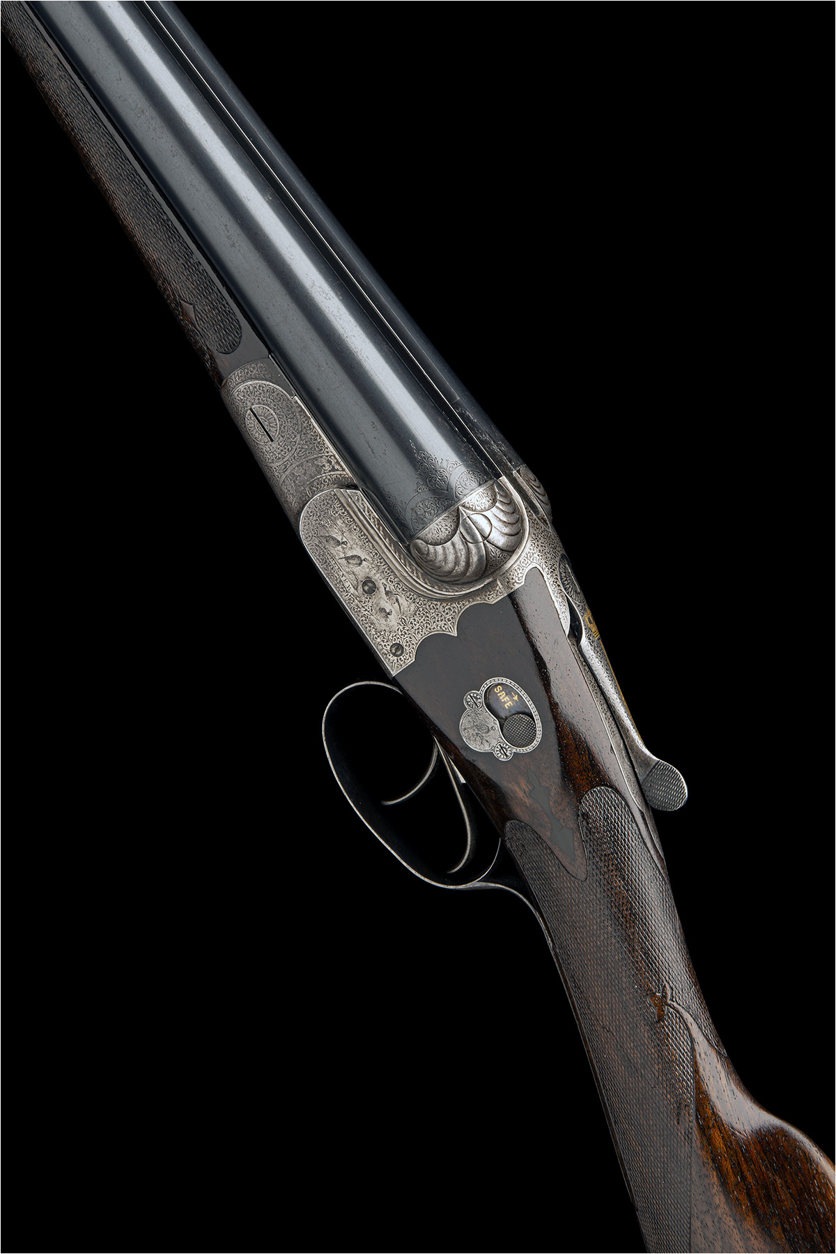 30in. nitro reproved barrels (in 2018), the tubes engraved 'SIR JOSEPH WHITWORTH'S FLUID COMPRESSED STEEL.' and the rib engraved 'W.W. GREENER. 68. HAYMARKET. LONDON. WORKS ST. MARY'S SQUARE. BIRMINGHAM.', 2 1/2 chambers, bored approx. 1/4 and full choke, wall thicknesses below recommended minimum, scroll-back action with side shoulders, double shell carved fences, the toplever gold-inlaid with a crown and sceptre, manual side-safety with gold-inlaid 'SAFE' detail, the surround engraved with a pheasant resting on a branch, the action and furniture profusely engraved with acanthus scrollwork interspersed with bands of leaf motifs and surrounding vignettes of pheasant, the underside with a woodcock in flight, the triggerguard engraved with a pair of hounds on point, 14 1/2in. figured stock (cracked at hand) with horn insert drop-points, fleur-de-lys chequering, including buttplate, weight 6lb. 9oz.