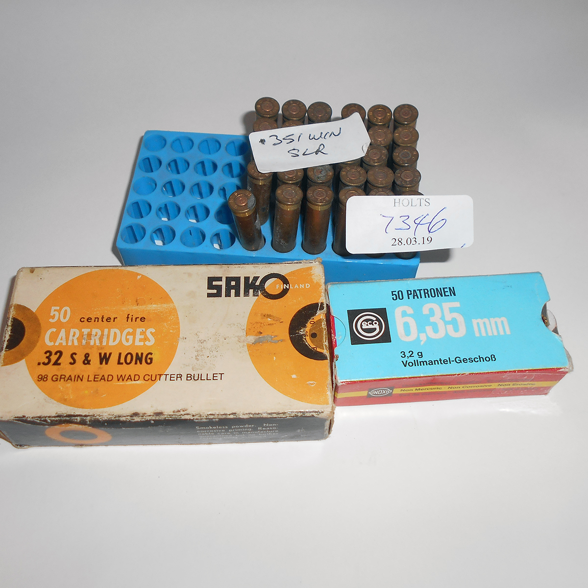 130 ROUNDS OF AMMUNITION , 50 .32 S&W, 50 .25 AUTO, 30 .351 AUTO, comprising of 50 Sako 32 S&W 98 grain lead wadcutter, 50 .25 auto/6.35mm, 49 grain fmc, 30 UMC .351 SLR some with slight corrosion.