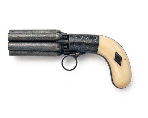 circa 1840, with six turn-off 2 3/4in. etched damascus barrels (mostly frozen), rounded breech-ends with rear-facing nipples, reblued rounded action inlaid with silver wire scrolls and vines, under-hammer operated via a ring trigger, smooth ivory grips with inlaid diamond-shaped grip-screw escutcheons and iron grip-straps, the rear with further silver wire inlay, the front marked 'MARIETTE BREVETE'