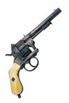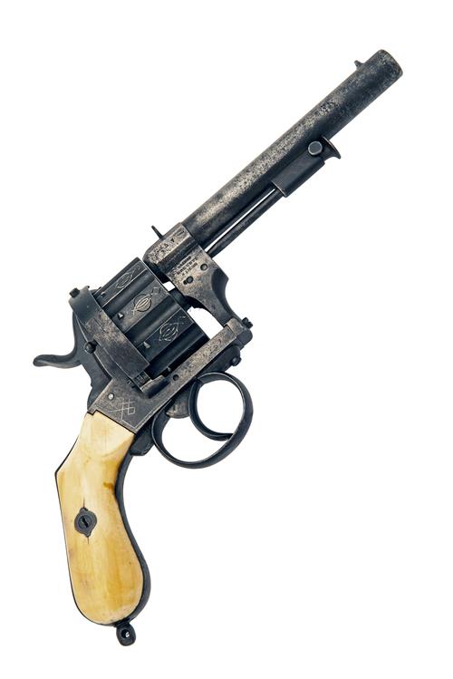 circa 1860, with round 6in. barrel, applied fore-sight, applied standing notch rear-sight to the octagonal form barrel throat (traces of silver geometric inlay to throat), the barrel mount on the right hand side signed 'ARENDT BREVETE A' LIEGE' together with the serial number (rubbed), fully fluted cylinder with silver wire geometric inlays above each chamber (losses to inlays), open iron frame with full pin shield mounted with a rocking safety and a side loading gate, traces of further geometric inlays to frame, external spurred hammer and guarded trigger, smooth bag-shaped ivory grips, stud for lanyard ring at heel (ring absent) and under-barrel ejector rod, the whole an older faded refinish
