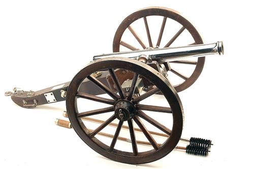 AN INERT 1/4-SCALE CANNON, metal and wood construction, with 15in. chrome-plated barrel and wood trolley with 12-spoke wheels