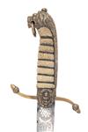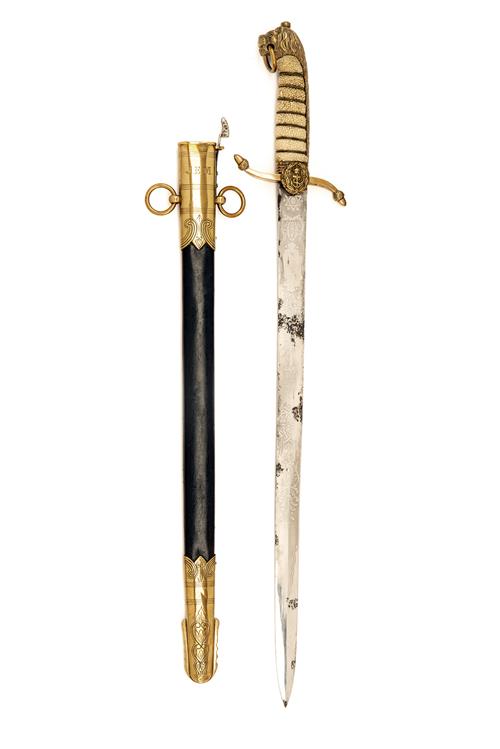 circa World War One, with straight spearpoint 17 3/4in. blade etched with arabesques and scrolls around a King's crown and anchor device on the right face and similar but with the Royal cypher on the left (some staining to both sides), maker's name at forte, brass 'S' shaped cross-guard with acorn finials, white sharkskin grip with wire binding and brass back-strap with integral lionshead pommel, complete with its brass mounted leather scabbard with integral locking catch, the throat initialled 'J.E.M.' and numbered '32' on the top-edge