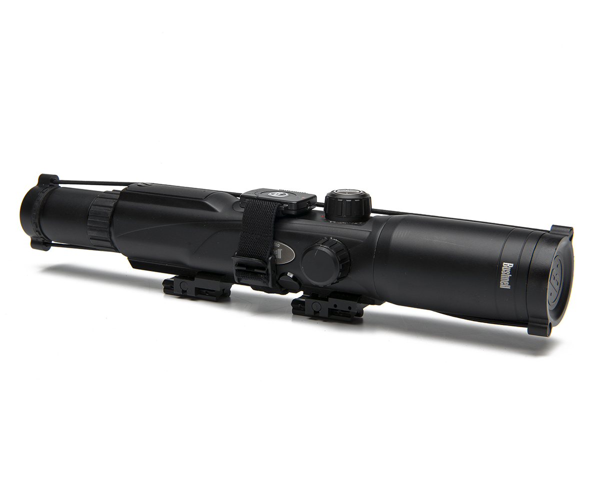 A BUSHNELL 'YARDAGE PRO 4-12X42' RANGE FINDER TELESCOPIC SIGHT, waterproof and fog-proof, with integrated range finder, lens protectors, dovetail scope rail