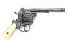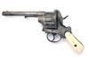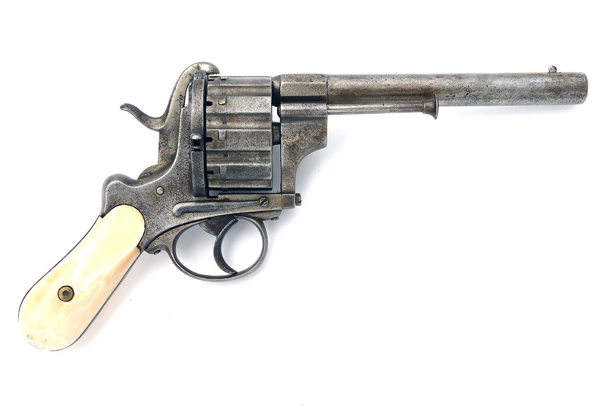 A 12mm PINFIRE TEN-SHOT DOUBLE-ACTION REVOLVER, UNSIGNED, MODEL 'LEFAUCHEUX TYPE', no visible serial number, circa 1860, with round 6in. barrel, dove-tailed fore-sight, no provision for rear-sight, fully fluted cylinder, open iron frame, side loading gate, external spurred hammer and guarded trigger, smooth bag-shaped ivory grips, stud for lanyard ring at heel removed and filled, side mounted plunge ejector rod, the whole cleaned of finish
