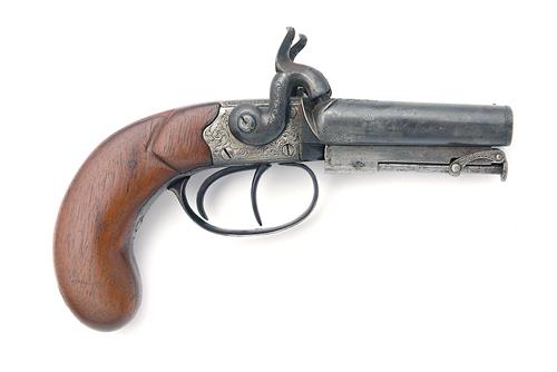 AN 80-BORE PERCUSSION DOUBLE-BARRELLED PERCUSSION POCKET-PISTOL, UNSIGNED, no visible serial number,