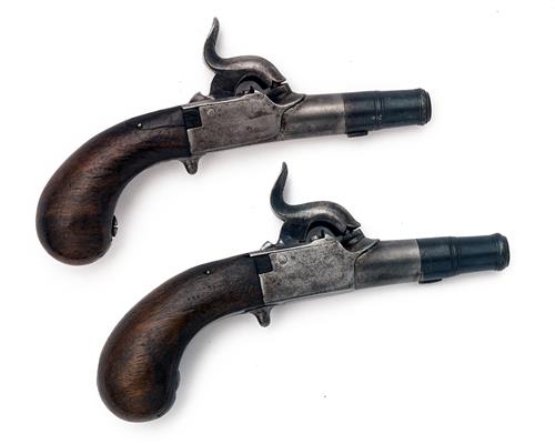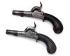 A PAIR OF 100-BORE PERCUSSION CANNON-BARRELLED TURN-OFF MUFF-PISTOLS WITH TEAT SAFES, UNSIGNED, no visible serial numbers,